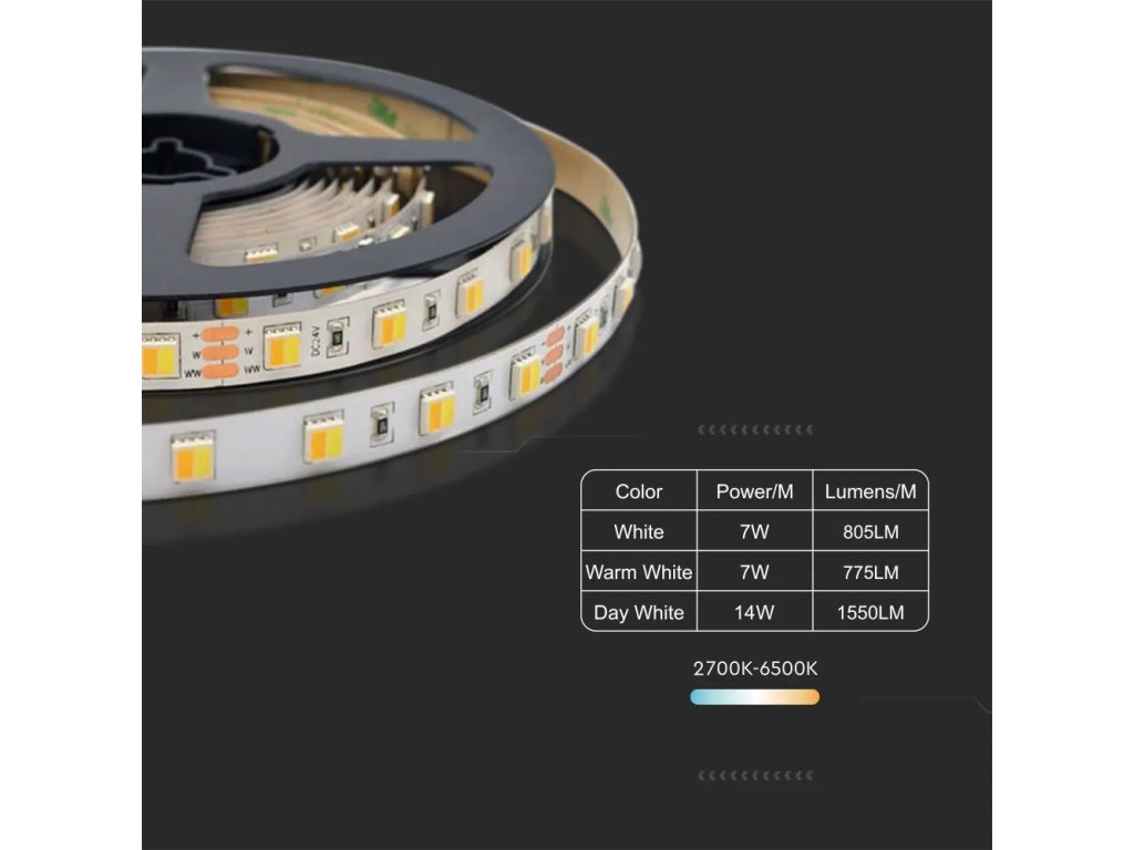 Bandă LED pentru exterior CCT, 24V, 14W/m, 1500lm/m, IP65, pachet 5m