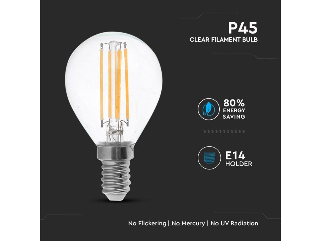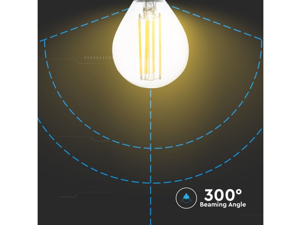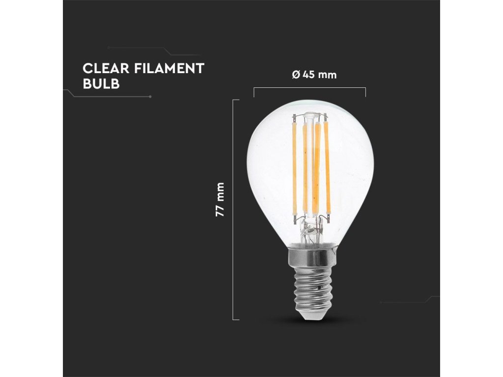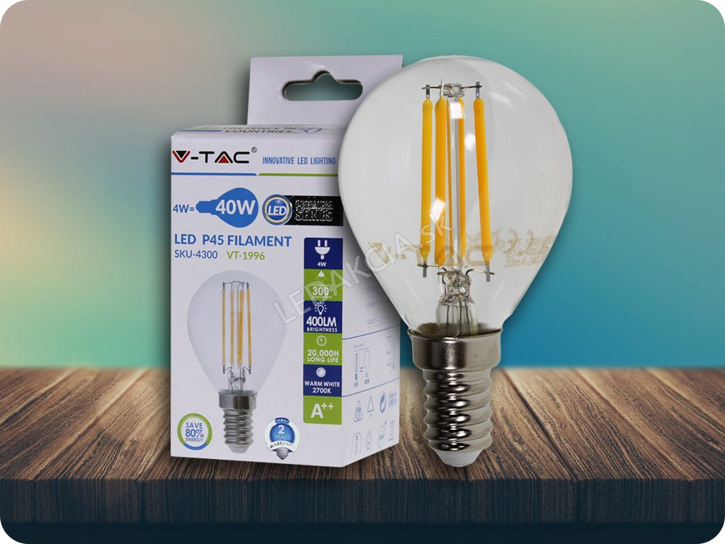 Bec LED cu un unghi de fascicul de 300 ° și un flux luminos de 400 lm. Puterea de 4W este un înlocuitor pentru vechiul bec de 40W. Dimensiuni: Ø45 mm x 86 mm. Clasa de eficienta energetica a becului este A+.