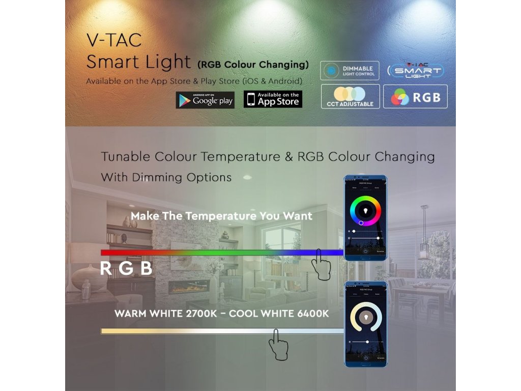 Lampa conține un modul wireless de 2,4 GHz care vă permite să conectați dispozitivul la o rețea Wifi. Datorită conexiunii Wi-Fi prin aplicația „V-TAC SMART HOME”, care este disponibilă pentru smartphone-urile iOS și Android, funcționarea poate fi controlată de la distanță.