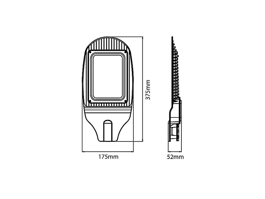 Iluminat public LED cu un unghi de fascicul de 100° și un flux luminos de 2400 lm. Puterea de 30W corespunde cu 150W. Variante de alb de zi 4000K și Alb Rece 6400K disponibile. Dimensiuni: 175 x 373 x 52 mm.