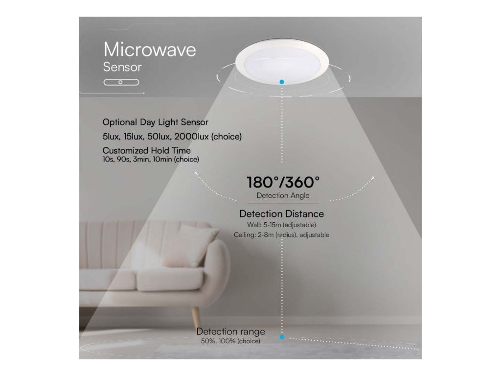 Distanța de detecție la instalarea pe tavan: 2-8 metri (reglabilă)