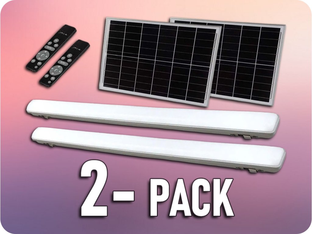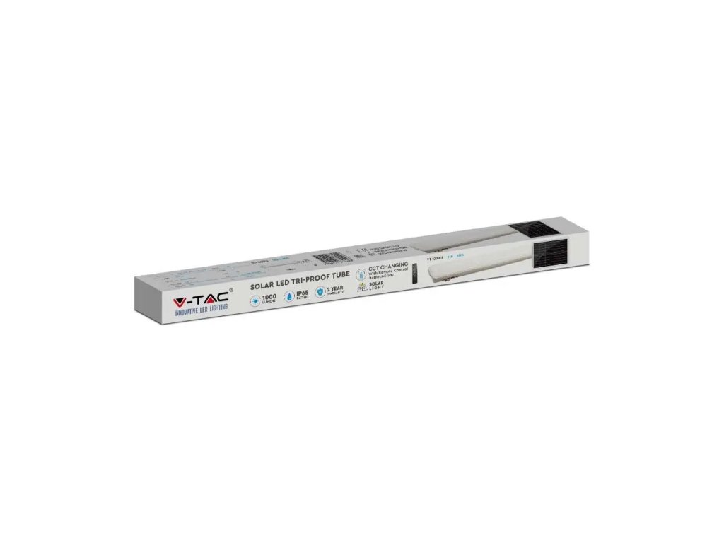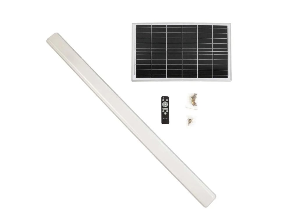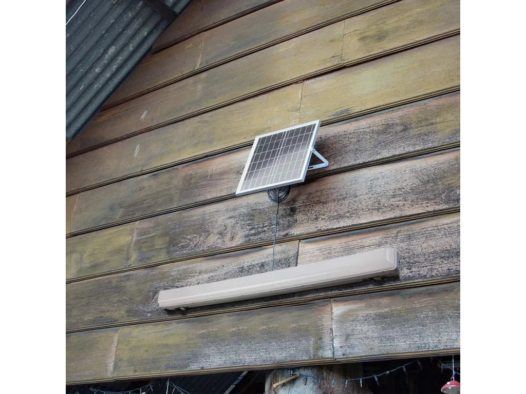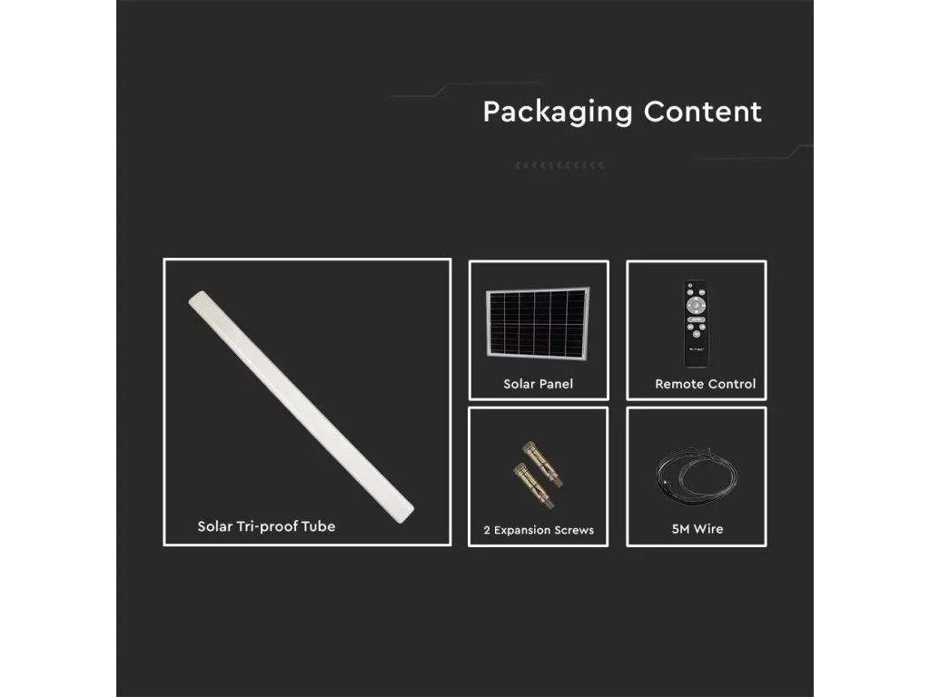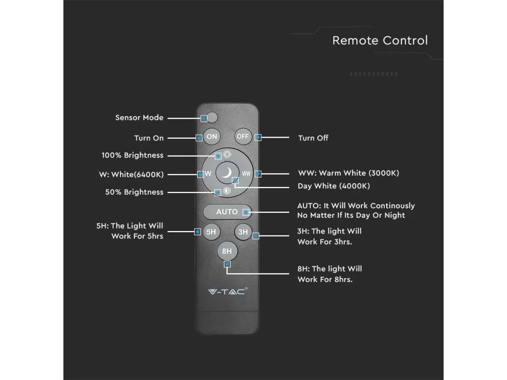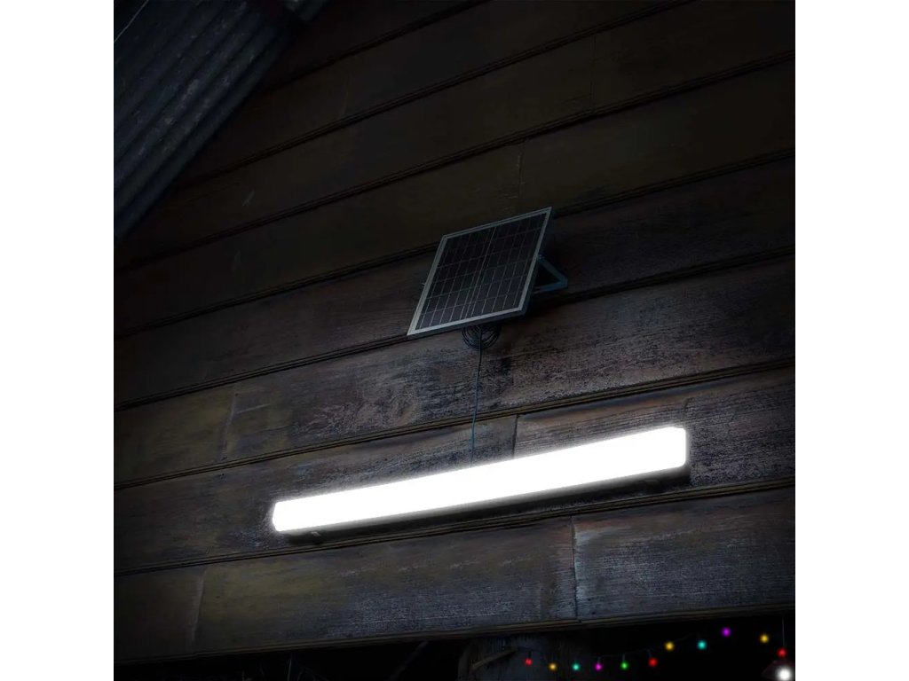 Panoul fotovoltaic livrat are un cablu de 5 metri și este conectat prin conector (2PIN) la o lampă de tavan care are în interior o baterie litiu de 18 000 mAh DC 3,7 V. Bateria are o autonomie de funcționare de aproximativ 8/10 ore. Încărcarea se face prin energie solară, care permite completarea stării bateriei în 10-12 ore. În plus, datorită telecomenzii, este posibil să porniți și să opriți lampa de tavan sau să setați trei temporizatoare diferite de oprire: 3 ore, 5 ore, 8 ore. Lumina se aprinde automat întotdeauna după apus și se stinge la răsărit. Această funcție nu poate fi dezactivată.