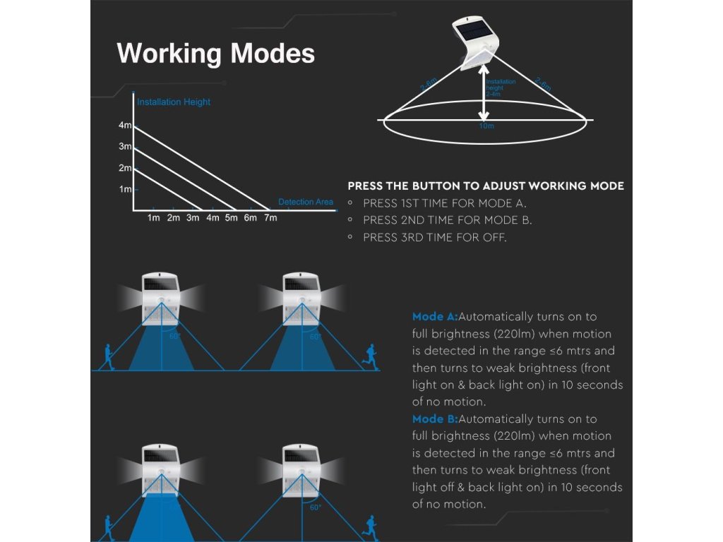 Lampa se activează prin apăsarea butonului situat în partea din spate. În plus, datorită detectorului PIR încorporat și senzorului de lumină, pot fi programate 3 tipuri de moduri de funcționare: