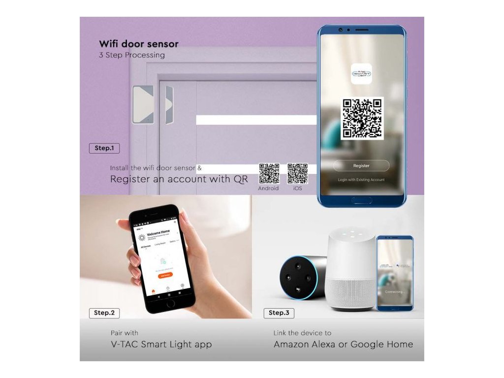 Senzor ușă WiFi 2xAAA (aplicație V-TAC smart light) compatibil. cu Google Home și Amazon Alexa alb