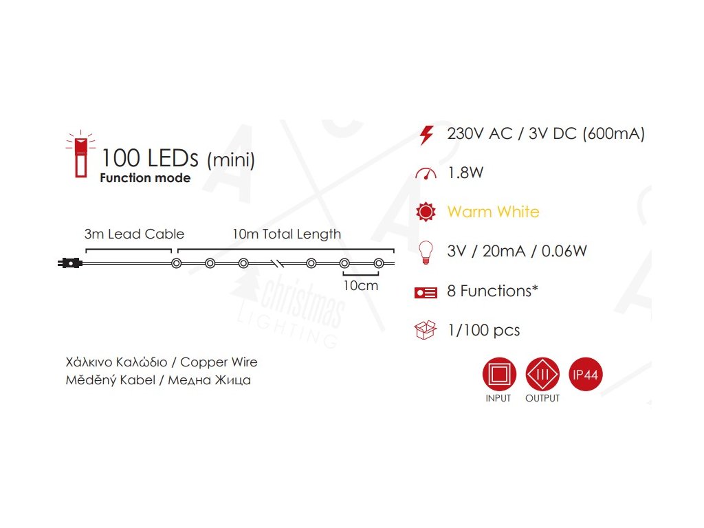Șir LED decorativ de 10m, 100LED, 8 funcții, cu adaptor, cupru/2-PACK!