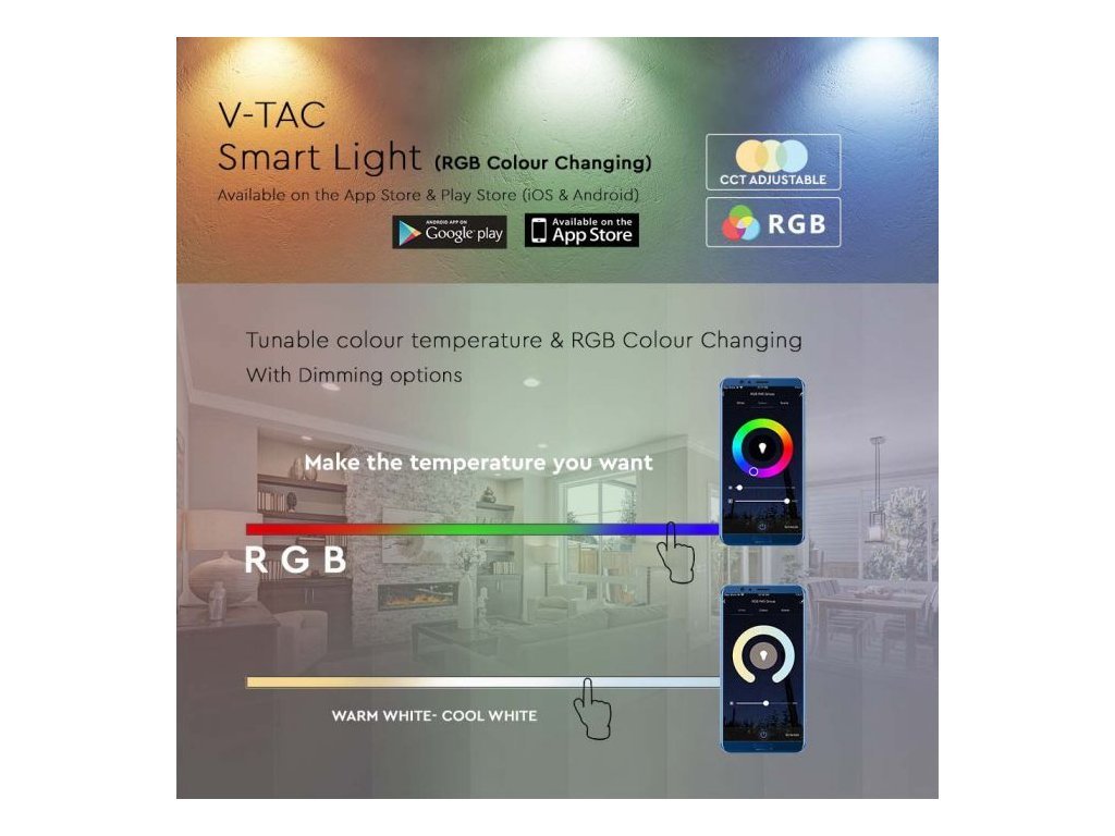 - Opriți lumina, schimbați culoarea, diminuați intensitatea luminii și multe altele, utilizând aplicația V-TAC