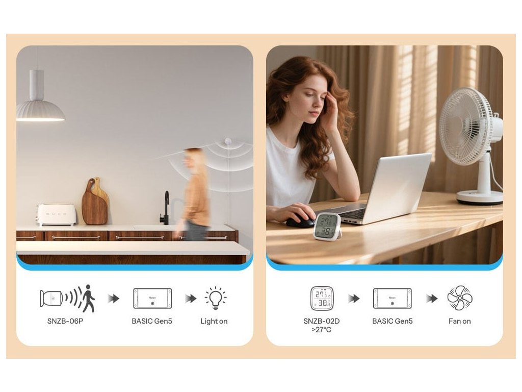Sonoff Basic R5 Gen5 vă permite să setați scene, programe și acțiuni condiționate care simplifică rutina zilnică. De exemplu, puteți aprinde luminile la apus, opri încălzirea după o anumită oră sau porni ventilatorul când temperatura depășește o valoare setată.
