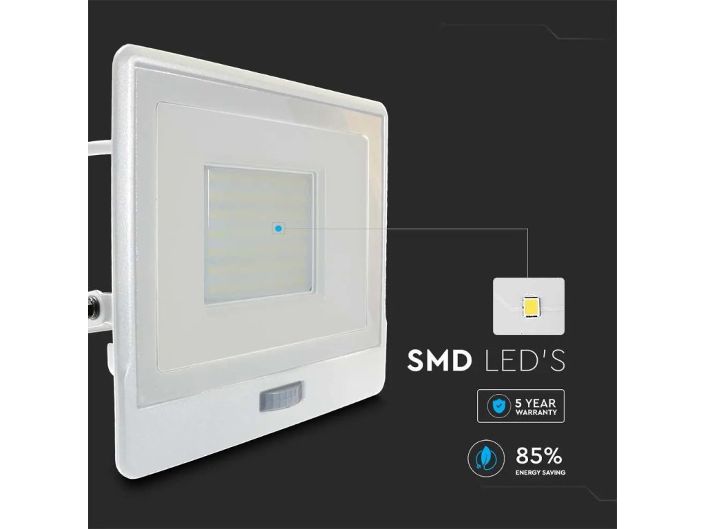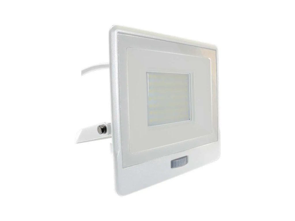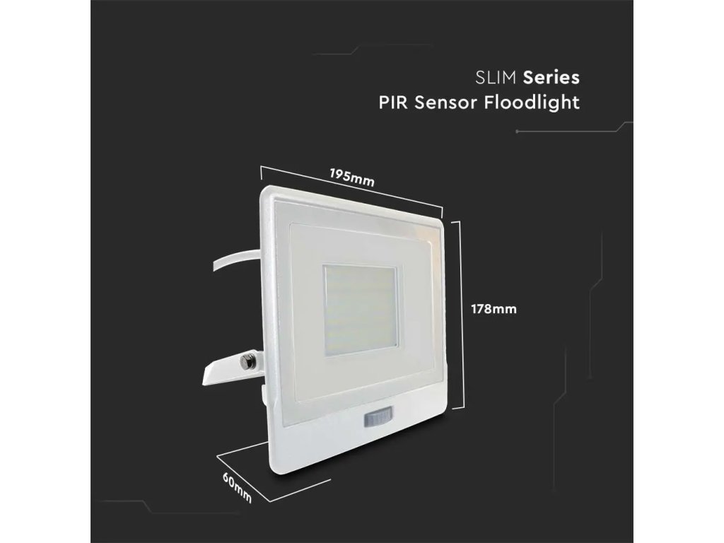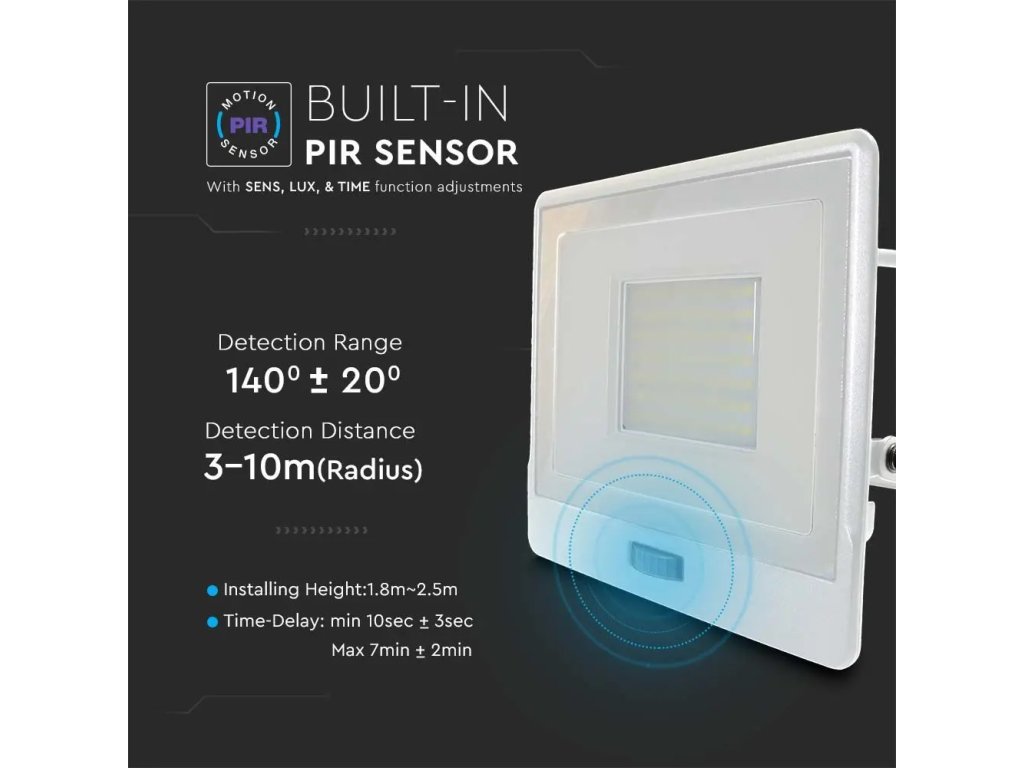 Spot LED cu senzor PIR 50W, 4000lm, cip Samsung, cablu 1m, 100°, IP65, alb